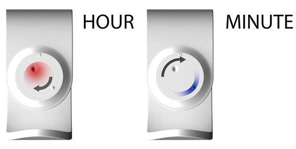 O círculo das horas é o do centro, com o indicador côncavo e a uma temperatura de 37ºC. Já o dos minutos é mais fino e fica em volta do das horas; possui indicador convexo e temperatura de 12°C.